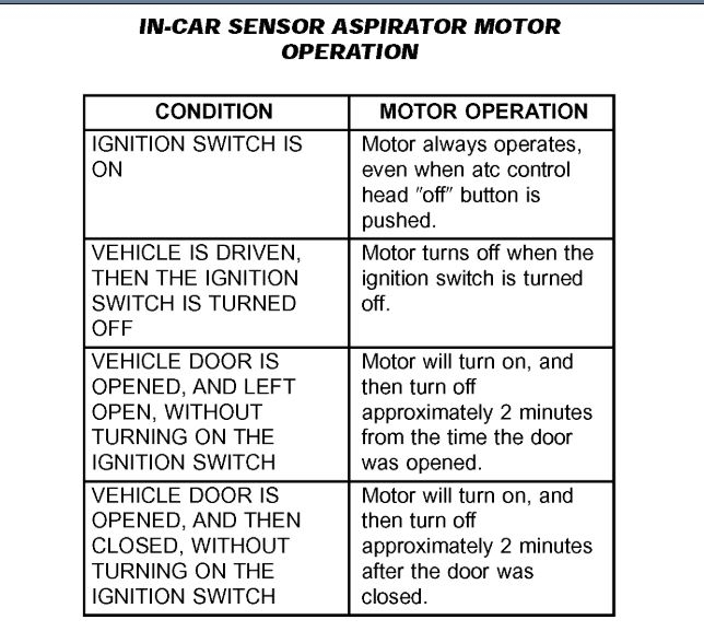 Air is drawn from the passenger compartment by the aspirator motor, and flows over the in-car temperature sensor thermistor. The thermistor changes resistance with air temperature. The BCM measures this resistance and calculates the temperature of the air drawn into the A/C-heater control. The ATC system then makes adjustments to maintain the optimum passenger compartment comfort. Refer to the In-Car Sensor Aspirator Motor Operation table for when the aspirator motor is operating.