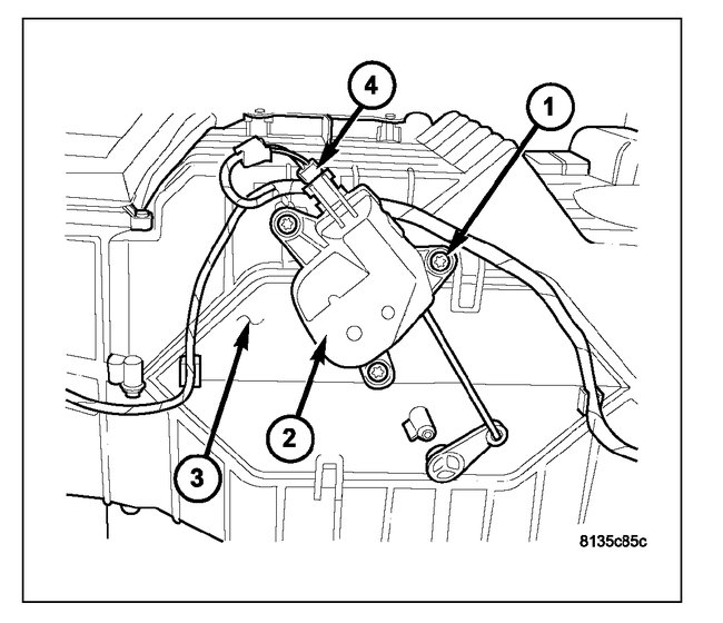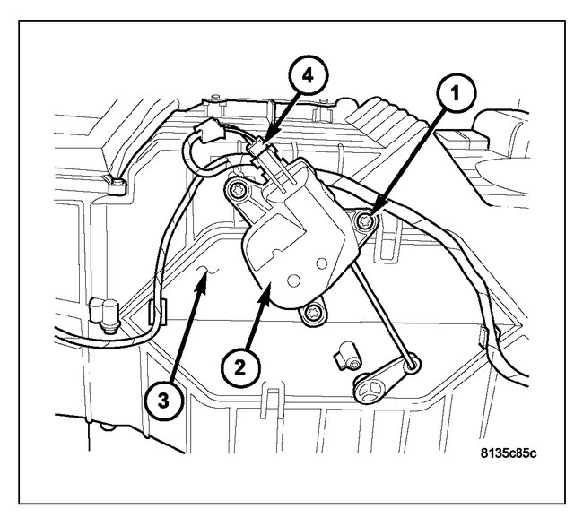 1. Install the blend door actuator (1) onto the back of the HVAC housing (2). If necessary, rotate the actuator slightly to align the splines on the actuator output shaft (3) with those on the blend door lever (4).
