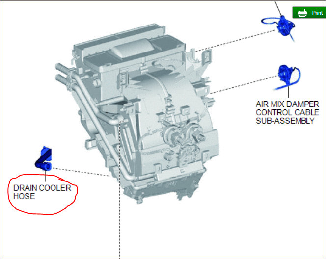 When the A/C is running when I go around curves it drips on my foot on driver side. How can I fix it? Do I blow something out? If so where? Any diagrams?