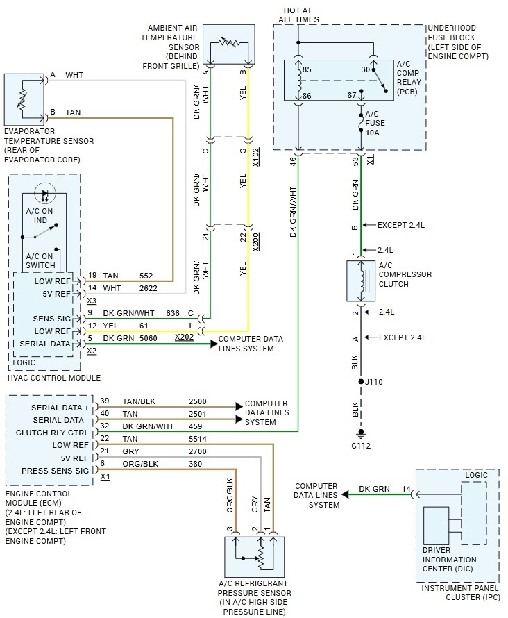 The Captiva uses a single pressure sensor on the system instead of switches. Basically, it's a variable resistor and not a simple pressure switch. Easy to test it as well. Take a meter set to volts and look for 5 volts between pins 1 (tan wire) and 2 (Gray wire) on the connector with the key on. Pin 3 (orange w black) is the signal out to the ECM. I would check the AC fuse to verify it is getting power when the AC is commanded on. It is after the relay so it would also tell you if the relay is activating. If you use a back probe at the X1 connector terminal 32 on the ECM (dark green wire) that wire switches the ground side of the relay control. So, to test the relay you could simply apply ground to it, if the relay operates and the compressor clutch engages the relay and its parts are okay. If you do that but still do not have cooling, then I would check the state of charge in the system.