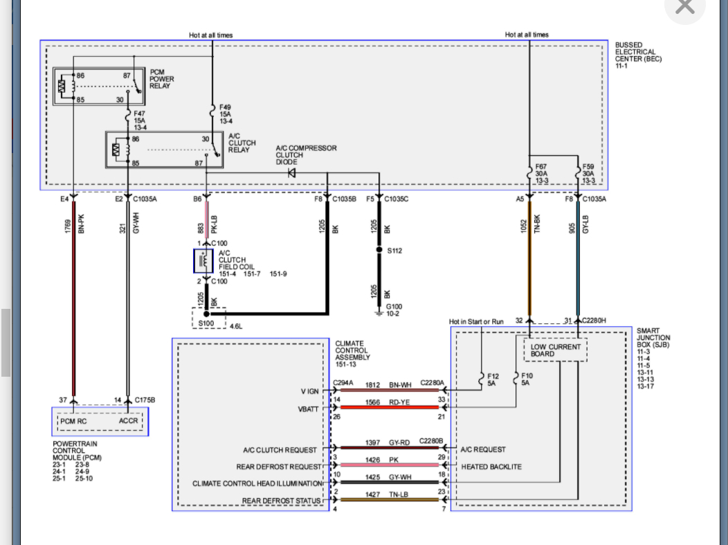 While it would be good to confirm this with monitoring the PCM, it appears the way this works is when you press the A/C button, it sends voltage to the smart junction block as you can see on the first diagram. The SJB then sends voltage on the A/C clutch cycling pressure switch. If the pressure switch is closed then it sends the voltage to the dual pressure switch on pin 1 and 4. The PCM is the ground for this circuit so if it gets 12 volts due to both switches being closed, then it commands the clutch relay to close.