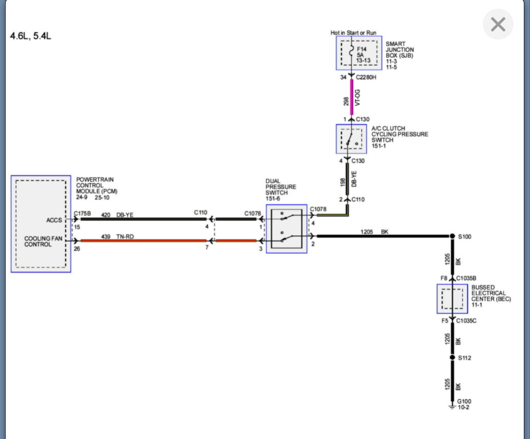 Also, these OEM diagrams explain this a little better than the AllData ones. You can see the pin 2 and 3 of the dual pressure switch are for the cooling fan which is why that came on. However, the PCM still is not commanding the clutch on.