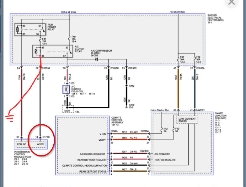 If you connect the entire system and start the engine and turn the A/C on, you should have 12 volts at pin 15 of the PCM C175B. If you do, then the PCM should be grounding the relay, but it is not.