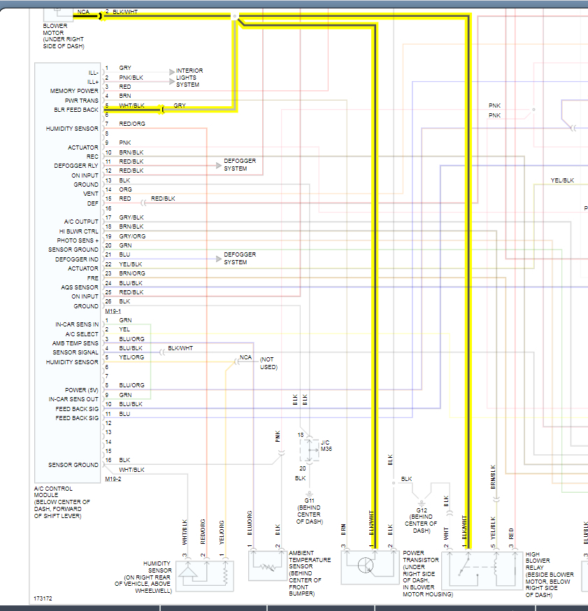 However, if you want to confirm this I attached the wiring diagram and we need to monitor the voltage from the control module on the blower feed back and then on the A/C output. You will see that the voltage will go away on the A/C output circuit when you switch the fan to high.