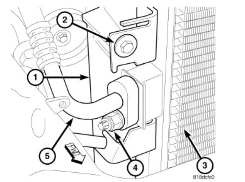 8. Remove the nut (4) that secures the A/C discharge line (5) to the A/C condenser (3) and disconnect the discharge line.