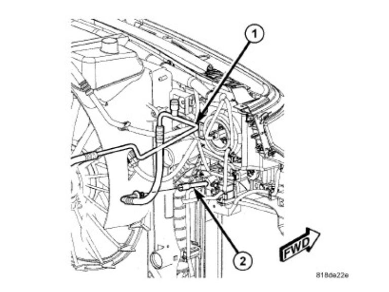 4. Disconnect the A/C suction and liquid lines from the A/C expansion valve, remove and discard the O-ring seals and position the refrigerant lines out of the way.