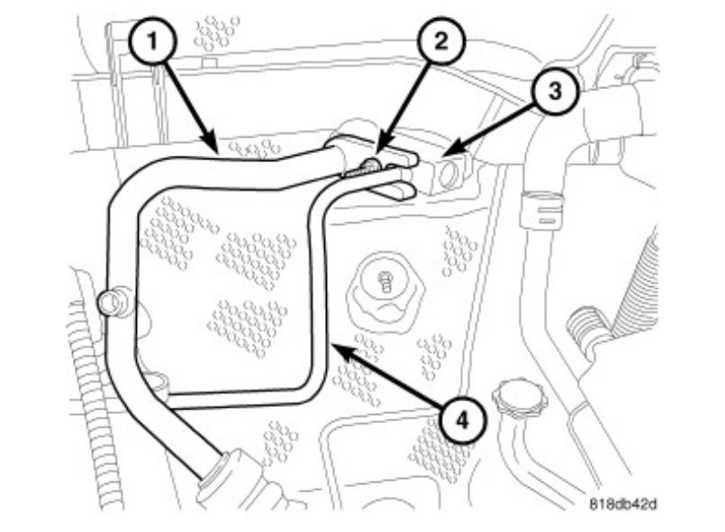 3. Remove the nut (2) that secures the A/C suction line (1) and the A/C liquid line (4) to the A/C expansion valve (3).