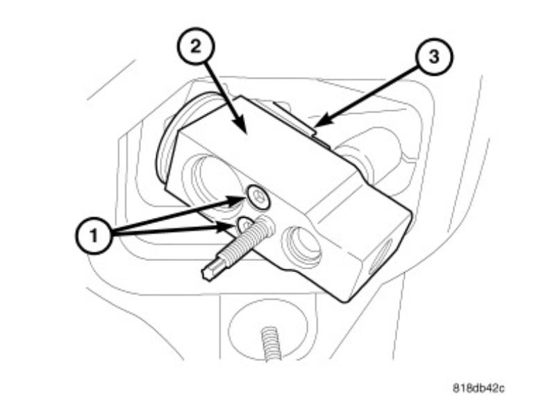 5. Remove the two bolts (1) that secure the A/C expansion valve (2) to the evaporator tube tapping block (3).