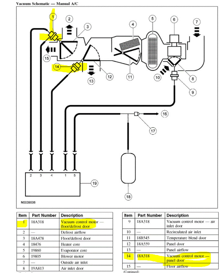 If you look at pic 2, it shows the vacuum schematic for your vehicle's HVAC unit. Number 16 is the hose that runs to the engine intake manifold and supplies vacuum to the system. The two highlighted components are the actuators I'm referring to.