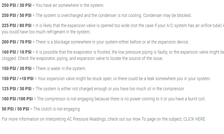 so bought gauges low=80 psi and high=98 psi when engine is off with engine running low=37psi but high=35 psi.