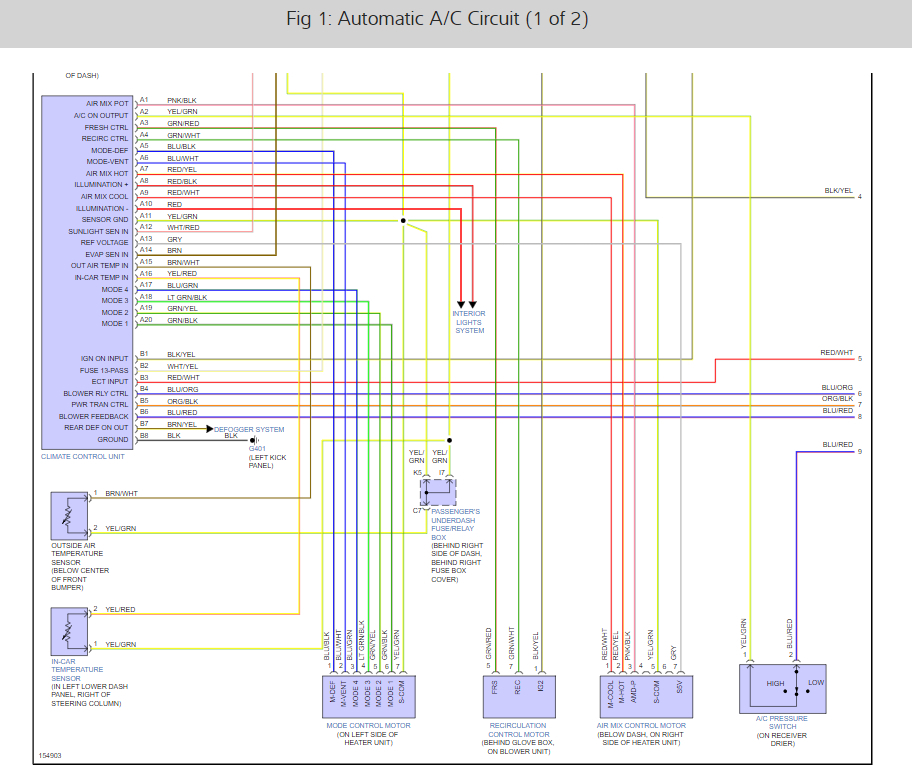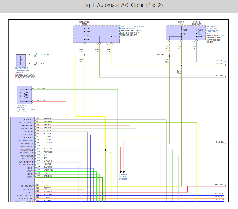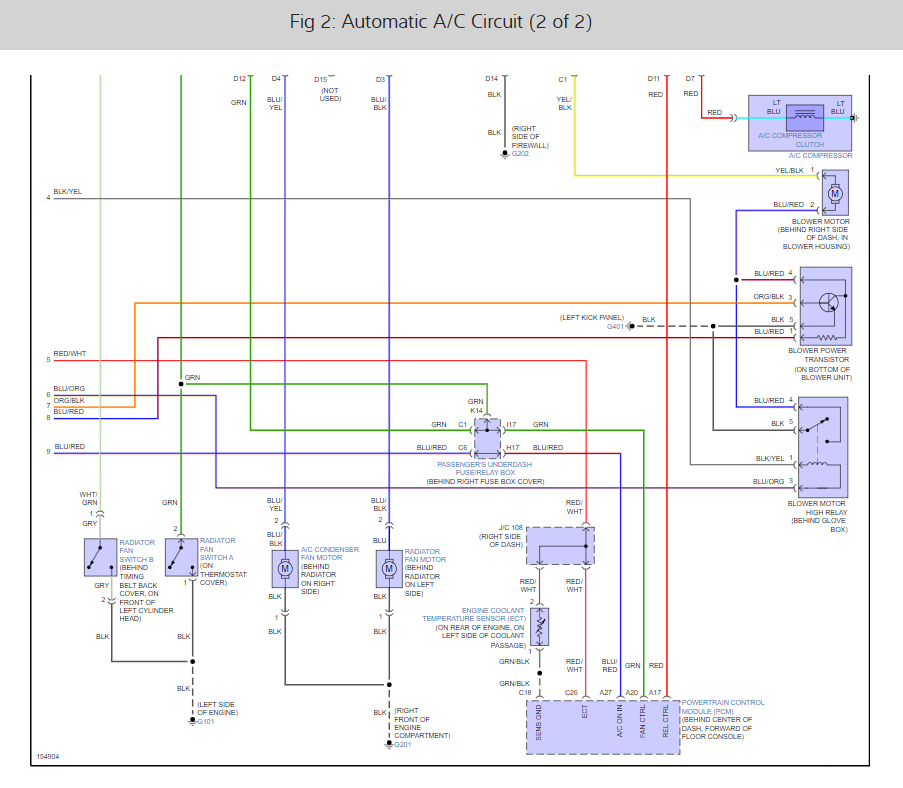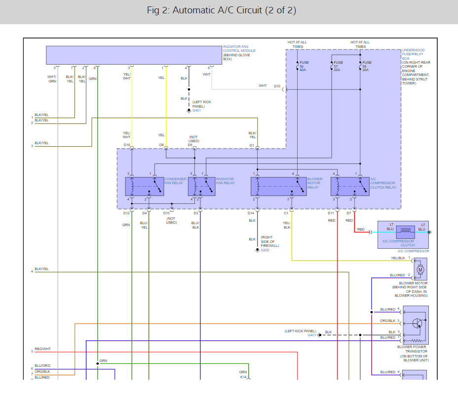 We checked all the relays and fuses for the A/C, fan, etc. There is power at the fuse box but there is no power at the A/C fan when the A/C is turned on. We have replaced the relays just to make sure it’s not them and it wasn’t.