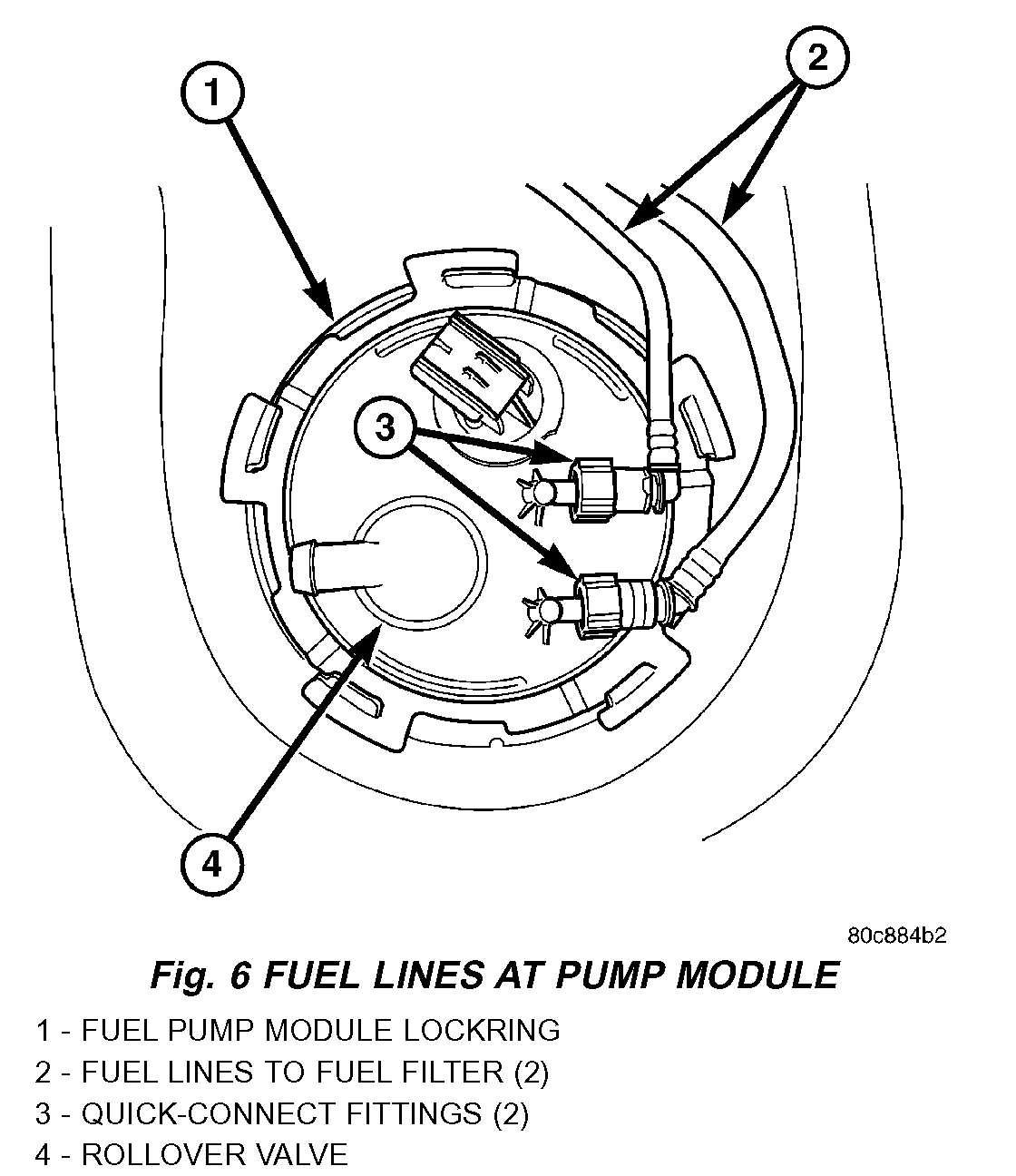7. Disconnect 2 fuel lines at fuel pump module by pressing on tabs at side of fitting.