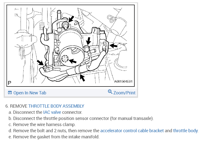 I included the procedure of how to replace the throttle body. However, I don't think you need to replace it. I think you need to disassemble the intake system far enough to see the throttle plate. Once you do this, remove the throttle cable from the throttle body and make sure it is not binding. If it is, replace it. If not, clean the throttle body and then retest the vehicle.