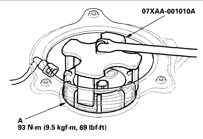 7. Using the special tool, loosen the fuel tank unit assembly locknut (A).