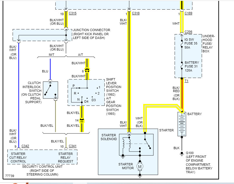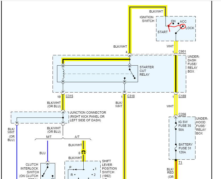 Okay, let's figure this out. First, I attached the starter circuit wiring schematic below so that you have a reference. I had to cut the pic in half to make it readable, but I did overlap them.