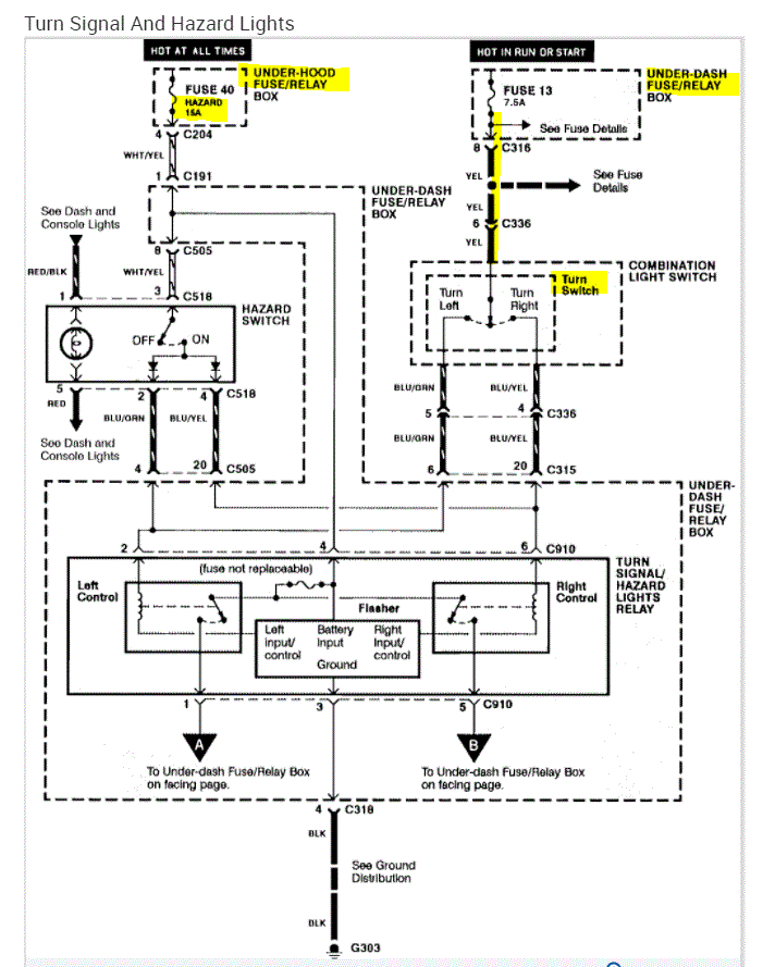 If you look below, I provided the wiring schematic indicating both the fuse for the signals and the hazard lights. Again, both will be in the fuse box under the left side of the dash.