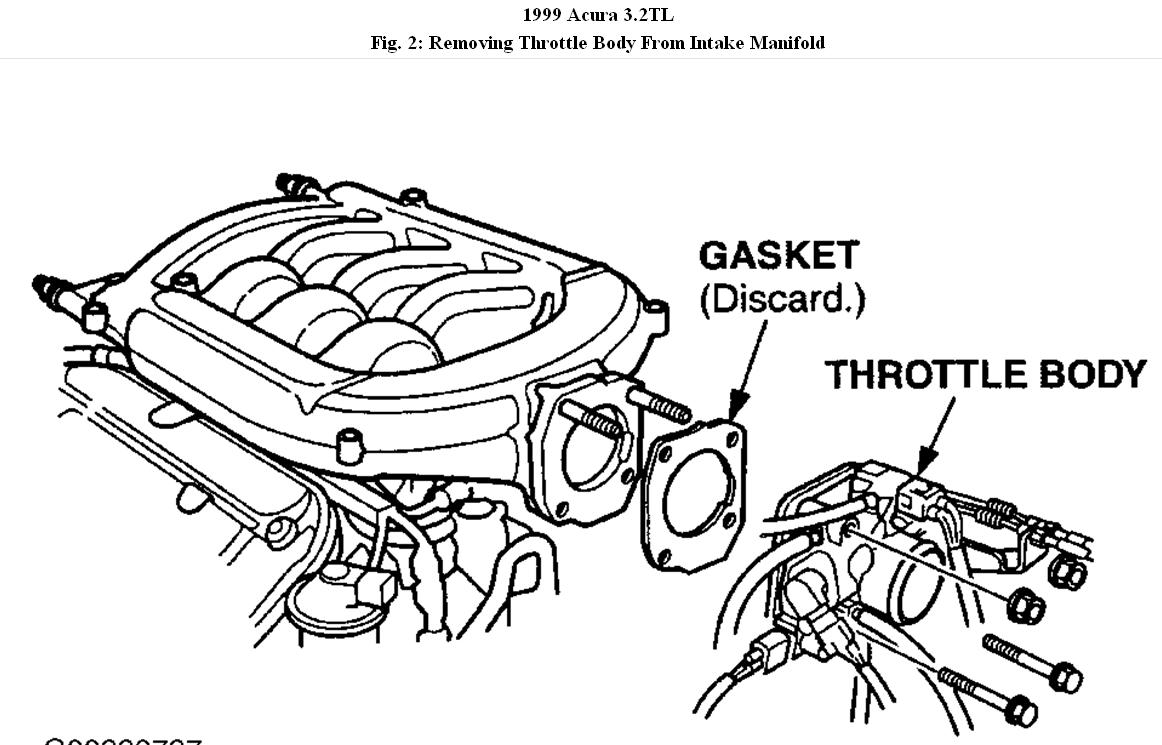 3. Remove the throttle body from the intake manifold (two nuts and two bolts). Leave all hoses, cables, and electrical connectors connected to the throttle body. Discard the throttle body gasket. See Fig. 2.