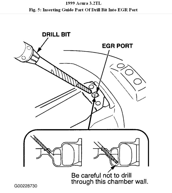 9. Insert the guide part of the drill bit into the EGR port. Make sure it is inserted fully. Then drill out the EGR port using steady pressure on the drill. Make, the port is drilled through completely. See Fig. 5.