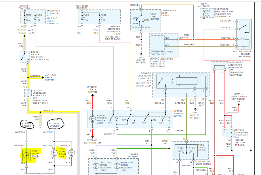 See pics below. Note: I cut the schematic in half to make it readable for you. I did overlap the two so you can follow from one to the next and highlight the relevant wiring.