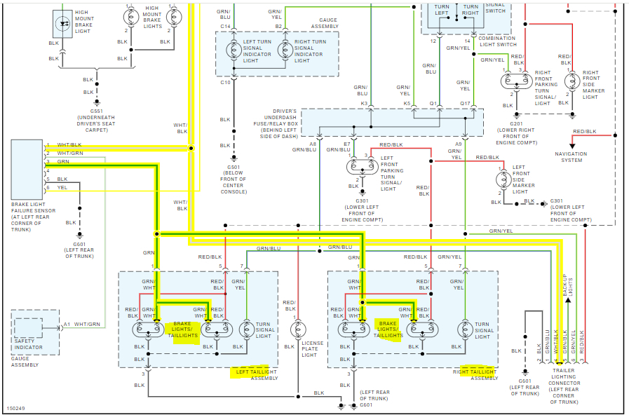 I attached the wiring schematic below so that you would have a reference. I need you to locate the green wire with the white tracer. There will be one on both sides at the lamp assembly. I need you to check if there is a power present. You can use a simple test lamp for this. Just have a helper press the brake pedal when you check.