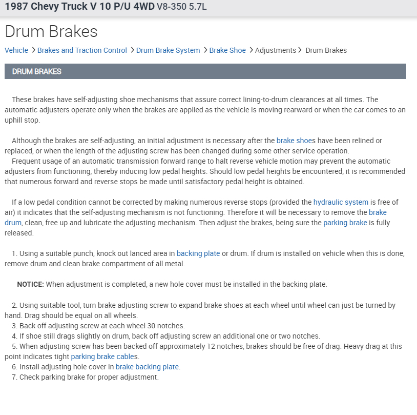 The rear drum brake shoes has an auto adjustment mechanism that will typically need to be adjusted when the shoes get replaced.