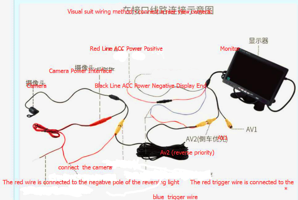 Bought backup camera off of eBay, having trouble installing. Directions sketchy. If I wire according to diagram, doesn't work. When I wire monitor to accessory positive and negative, all acc items stop working. If I wire the camera (off of red wire) and the monitor to direct power source and the camera (off of red/black stripe) and monitor to negative ground, I get an image, but it is not orientated properly. Also can you tell me what the small red wires on each end of the camera cable do? Also what the blue wire on the monitor does? See attached pictures.