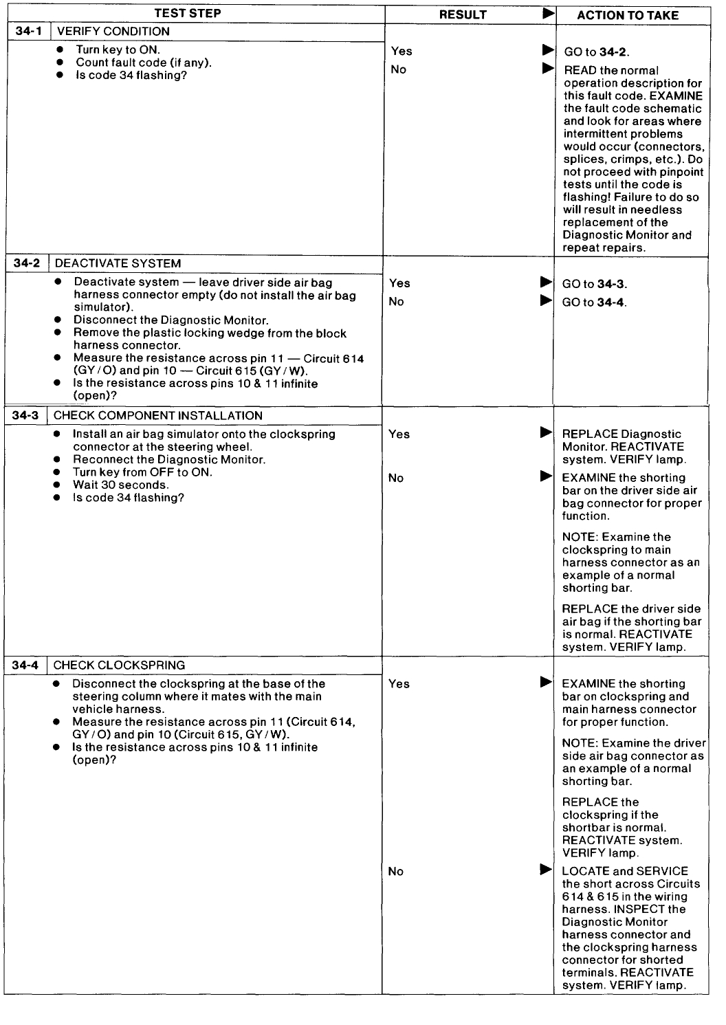 The diagnostic monitor measures the resistance across pin 10 (Circuit 615, GY/W) and pin 11 (Circuit 614, GY/O) every time the ignition switch is turned to the ON position. Normal resistance across these circuits is between 1.5 and 2.0 ohms. This resistance comes from the air bag itself (approximately 1.0 ohms ) and the clock-spring winding's (0.3 to 0.4 ohms per winding, two winding's in all). If the resistance across these two circuits is less than 0.7 ohms, the diagnostic monitor will flash code 34 on the air bag lamp.