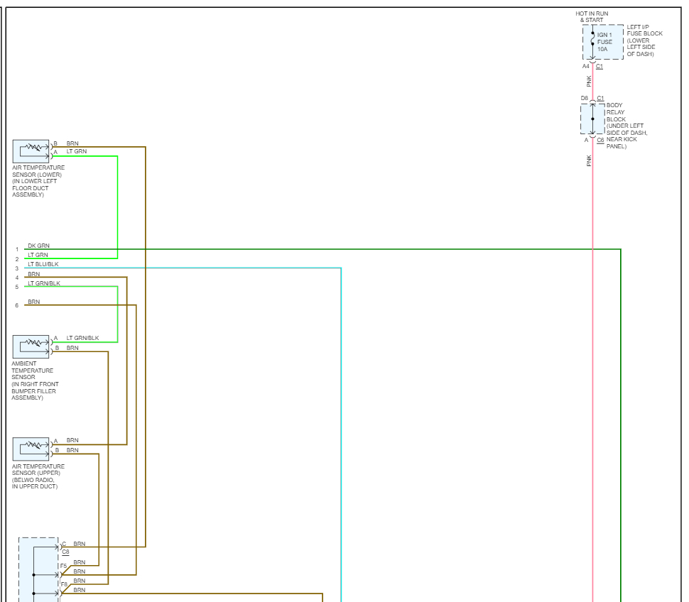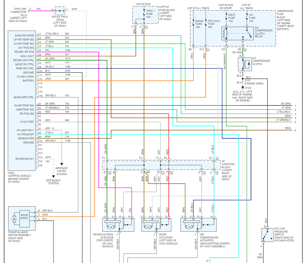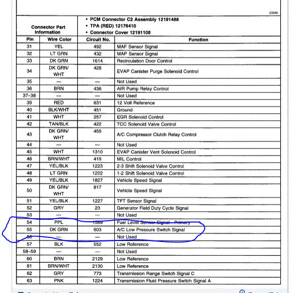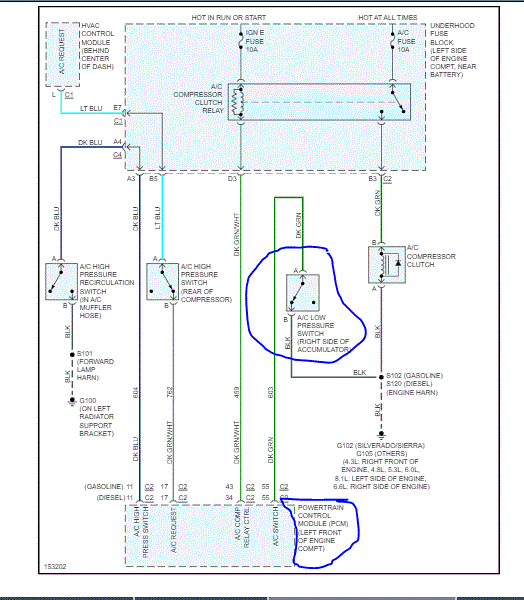 The low-pressure switch has no power and only two wires. It connects the ground circuit and signals the PCM here is the complete AC wiring diagrams so you can see how the system works. Check out the images (below). Please let us know what you find.