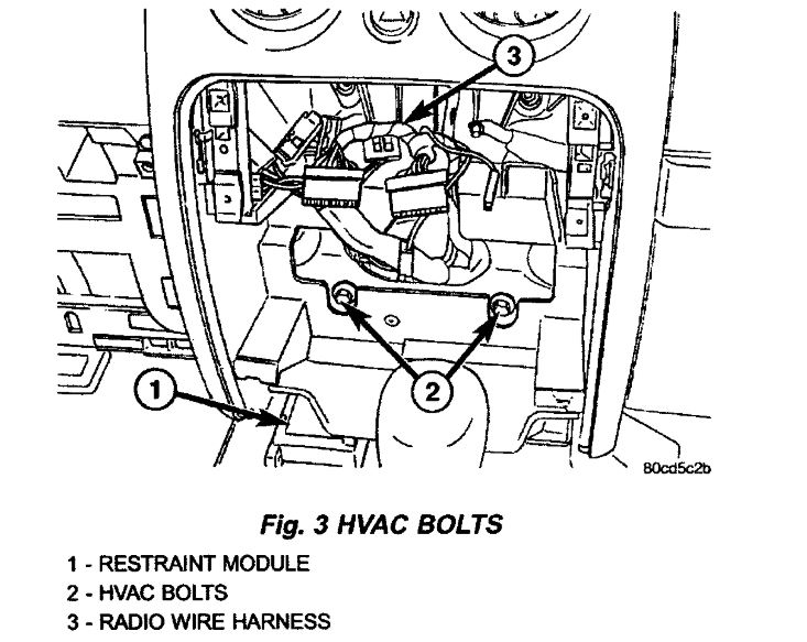 (17)Remove the two HVAC mounting bolts behind the center trim. (Fig. 3)