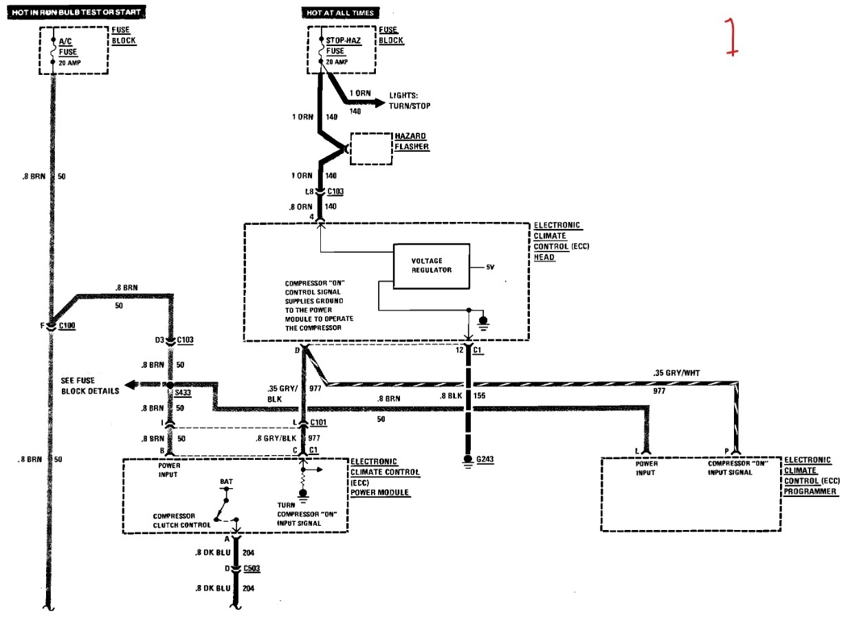 To test the A/C relay control you need the key on, A/C to max and set to a lower temperature. Now go to the clutch relay and check for activation of the relay. You can also apply a ground to the smaller brown wire and if the control voltage is there the relay should click on.