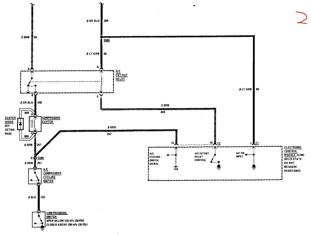 Now take your power probe and use it to check for continuity to ground on the brown wire at the clutch connector. An open ground could be a bad connection at the compressor cycling switch or at the low-pressure switch, both should test as normally closed if the system has a freon charge in it. If it is open then test those switches, or jumper them for the testing.