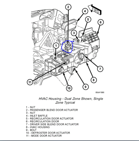NOTE: The single zone heating and air conditioning system is equipped with a single blend door actuator. The dual zone system has two blend door actuators, one for the driver side blend air door and one for the passenger side blend air door. The same service procedures can be used for each of these actuators.