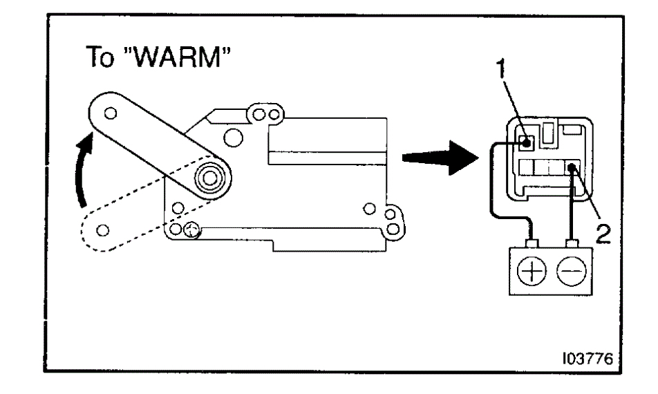 b. Connect the positive (+) lead from the battery to terminal 1 and negative (-) lead to terminal 2, then check that the arm turns to "WARM" side smoothly.