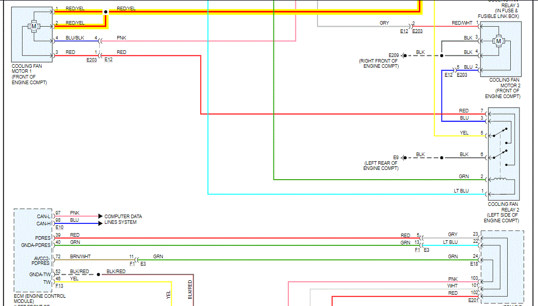 Radiator cooling fans are controlled by ECM. Refer to "Description" See: Cooling System Component Tests and General Diagnostics > Cooling Fan.