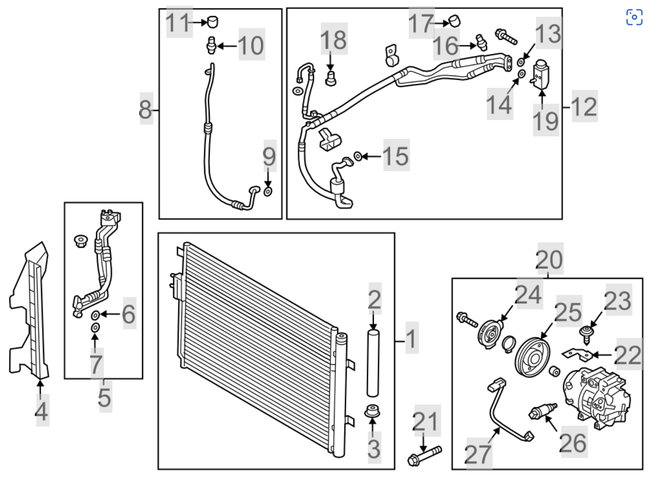 I am including a spec sheet that contains all the information on your A/C system like capacities and oil types. I also included an exploded view of the parts contained in your A/C system that are under the hood. You will see a box with a number 5 with a double hose and 2 O-rings. This is a very common place for a leak. It attaches directly to the condenser.