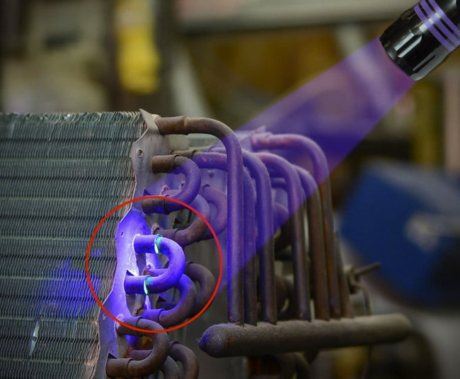 The good news is, there is always supposed to be dye added to the refrigerant. This is used to find leaks. I have included a picture below. You don’t need an expensive one, it just has to be a black light, well technically it’s purple but you get the idea.