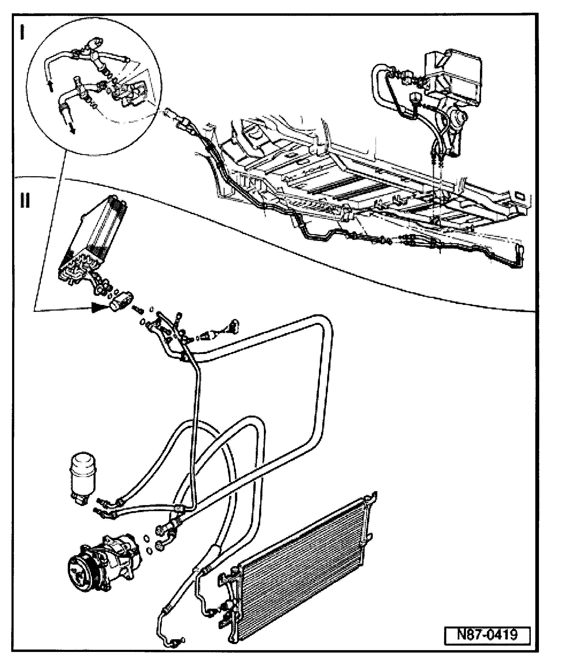 - Follow refrigerant recovery/recycling/recharging unit manufactures instructions for evacuating and recharging A/C system.