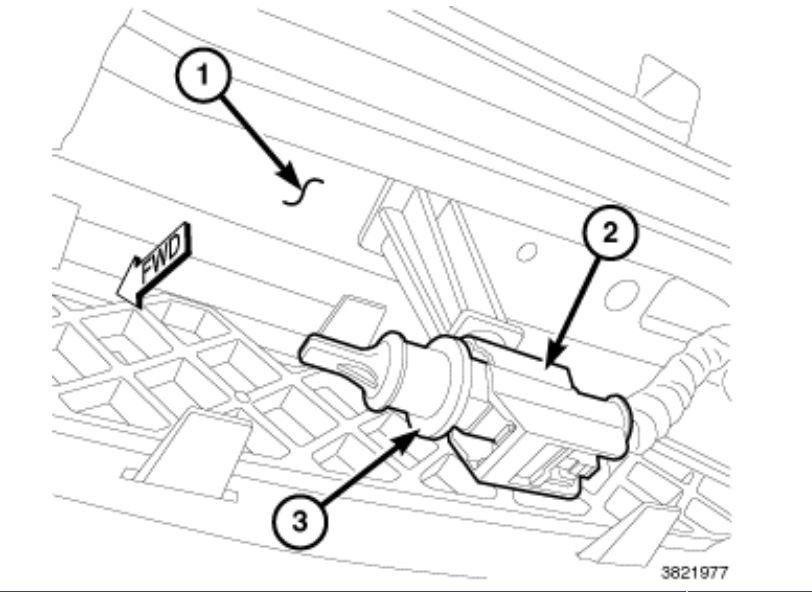4. Reach up between the lower edge of the front fascia and the front of the a/c condenser near the right end of the lower air intake opening to access the ambient temperature sensor (3) just below the front bumper (1).