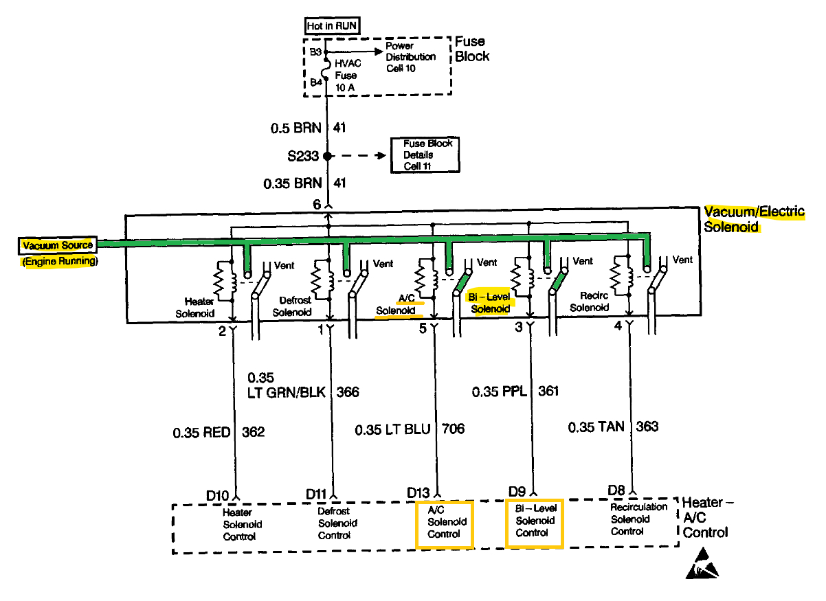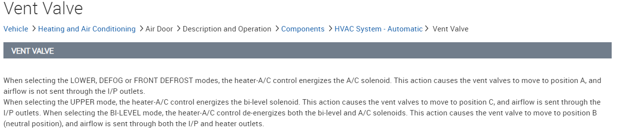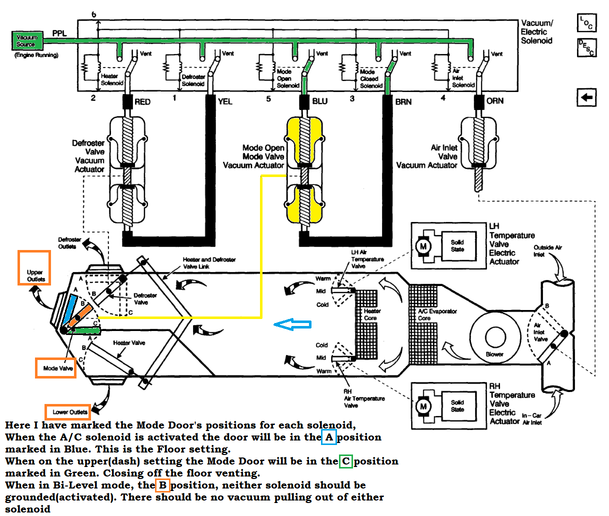 Per service info, it sounds like the A/C solenoid may not be either deactivating, or not closing all the way and is still pulling a vacuum through that solenoid somewhat, causing the vent door to not fully move to the C position where you would have just air flow from the dash vents. Hopefully I have that correct. When selecting the upper(dash) venting the HVAC controls activate the bi-level solenoid and this moves the door to the C position, closing off the floor vents, but if the A/C solenoid is stuck partially open, it will still pull vacuum and keep the door from moving fully,