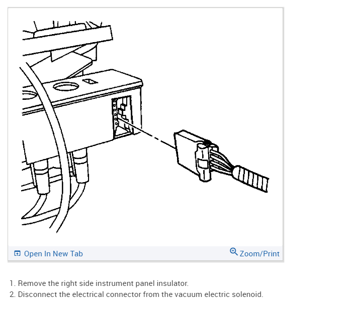 This solenoid block is just right of the Blower motor on the passenger side lower dash, I'm not sure if these vacuum lines are plastic or rubber hoses, so just try not to break them, if they hard plastic and can't be pinched off then try unplugging the lines and blocking them off one by one to see which one may be holding the vent door from closing all the way. It looks like the vacuum hoses are supposed to be different colors, but that's not always correct. But this is the location to see if it's an issue with the vent door moving, or if it's a solenoid issue. You may find that one of the vacuum lines is broken as well, when they get old, they are brittle and can break pretty easily. But let us know what you find.