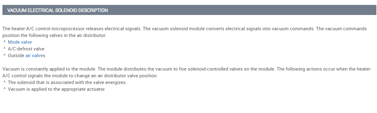 This system uses engine vacuum and a solenoid block to move the vent doors, refresh this page and take a look at my last post, I updated some info, but I will find a picture of the solenoid block for you to check.