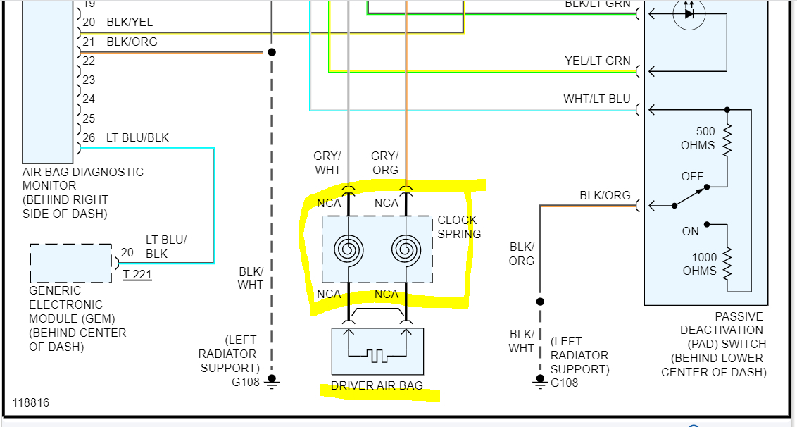 I attached the wiring schematic showing the clock spring along with the air bag. Note that the cruise control and horn depend on this to work.