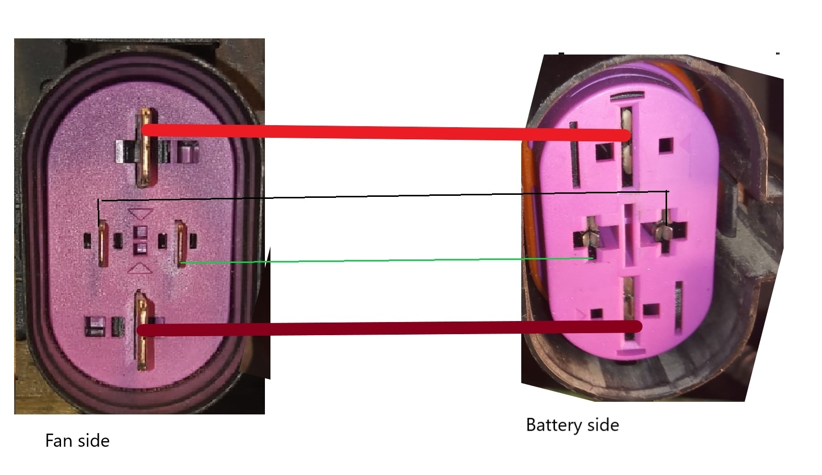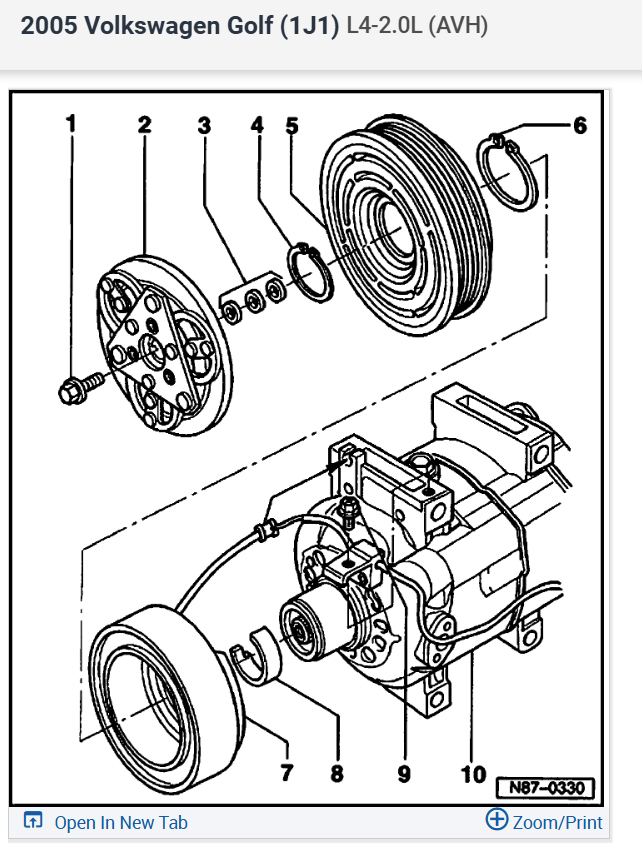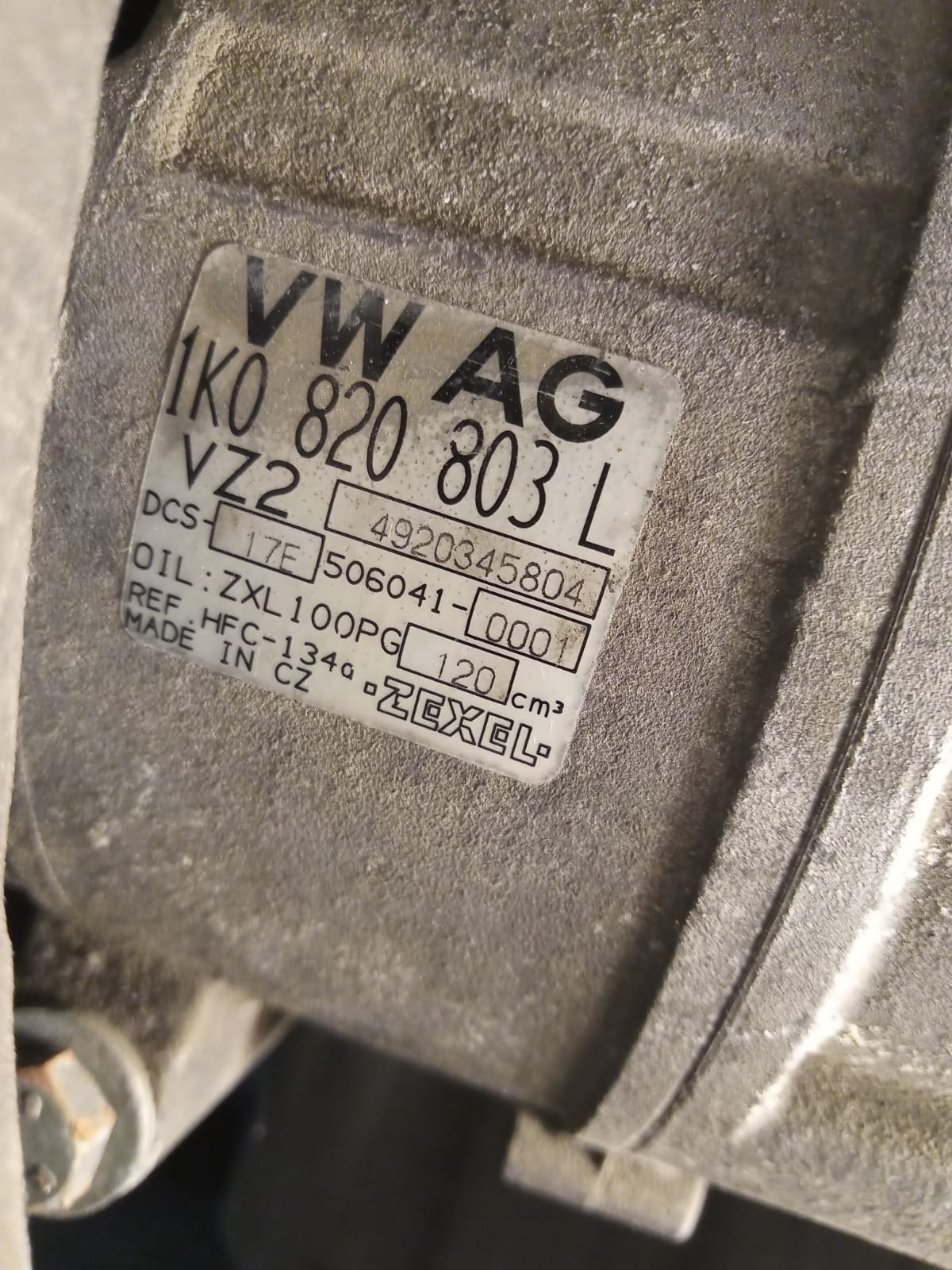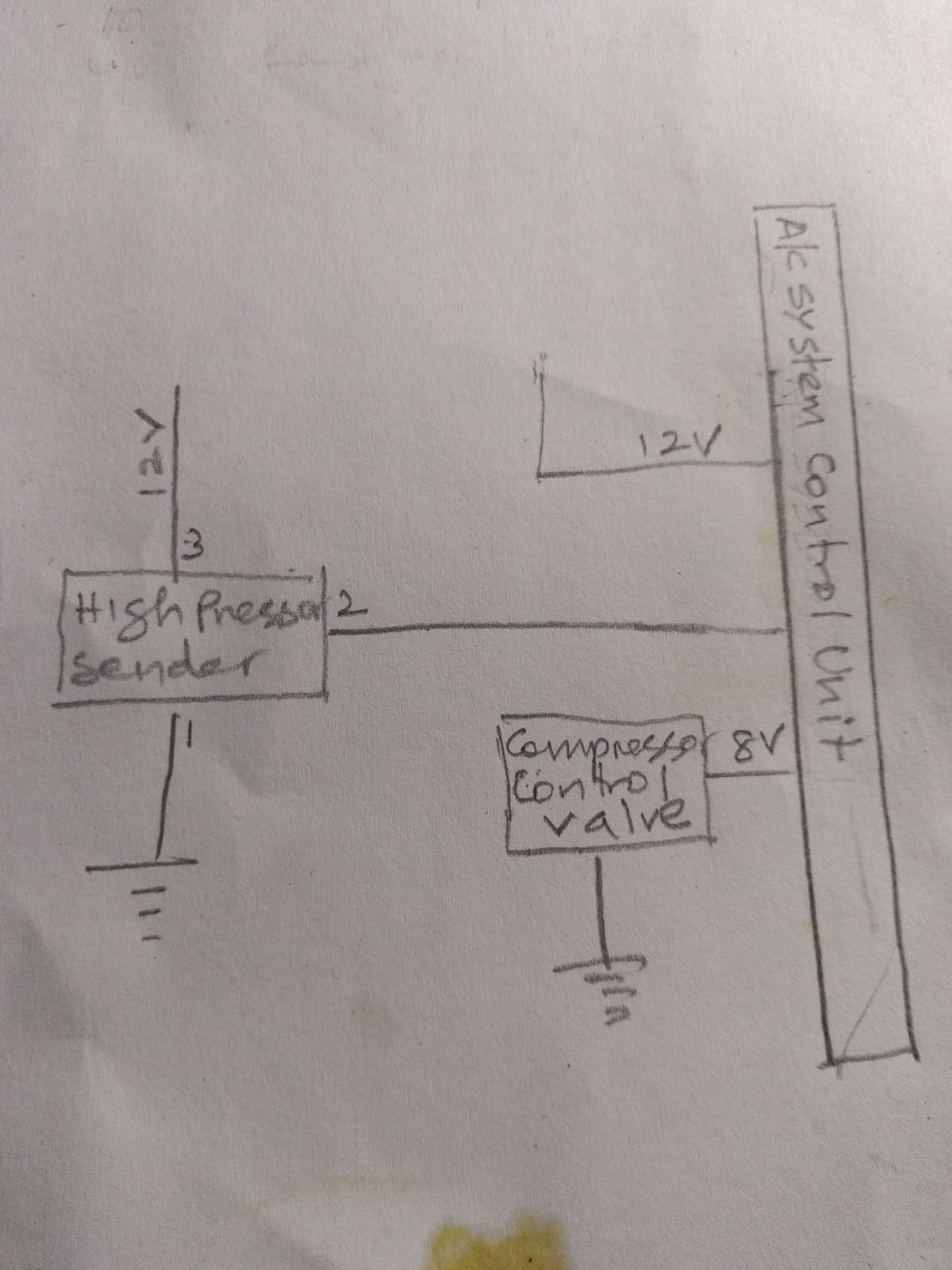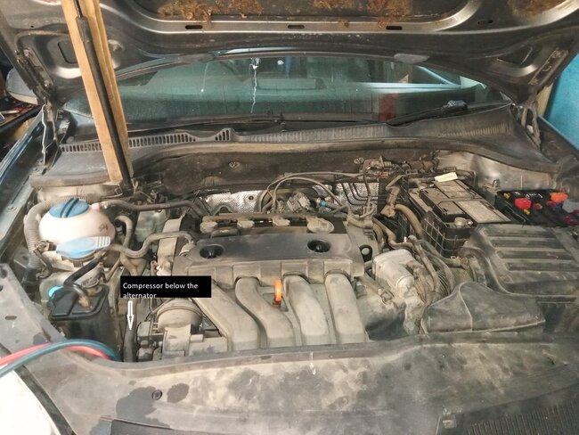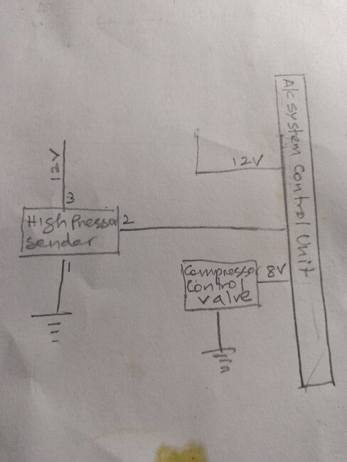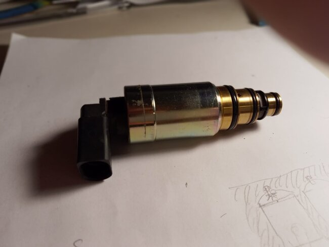 The air conditioning (A/C) is not working. I’m uncertain whether the compressor has a clutch because there is a control valve connected to the back of the compressor with two wires, and I don't see any other wiring connections. When I turn on the ignition switch, I measure around 5V on one of the wires. I can see the high-side pressure switch, but I cannot locate the low-side switch.