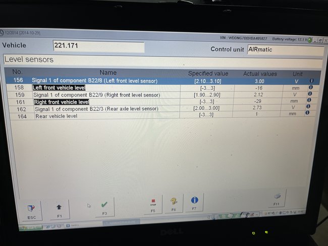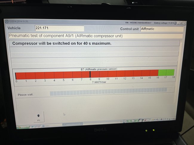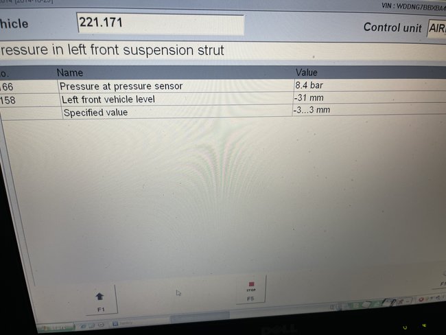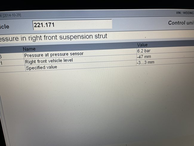 It had a bunch of codes, cleared them all but the only ones that keep coming back are these two, when I activate them they all start to rise. Compressor I think is not 100% functional cause it says it reached its time limit of 1 minute, so either there is a leak to the front right or compressor is weak. Hard to diagnose. Tested compressor and it showed 7 bars when it should have been 14. So not sure. The car airs 90% correct, the front right is a bit lower, but I drove it 40 miles and it was okay.