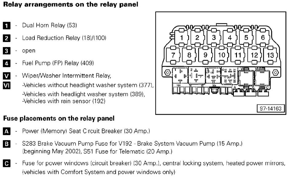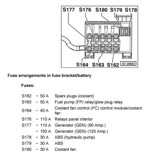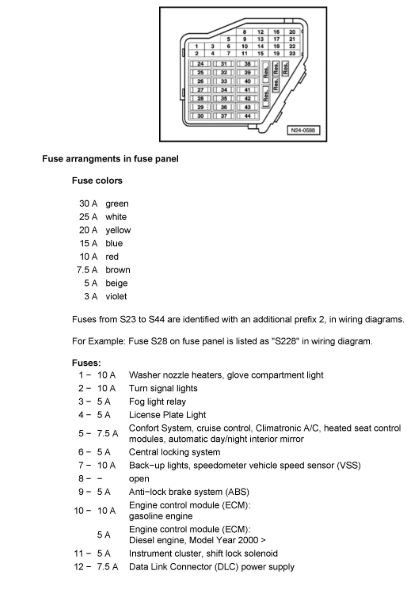 Sorry for the delay, I got pulled away for the day. Give me a minute and I will dig up the fuse panel legend and post it. If you find wetness then get all the way to the metal under the car make sure there's not a puddle. I've seen those get quite a lot of sitting water under some VW's drivers seats where the module lives. If that's what you find then look for a rubber plug in the floor and remove it, it's a drain plug for this issue, pull the other side plug as well to see if anything drains as well. There are plugs under every seat in the Passat's I know. I'm not sure about the other models.
