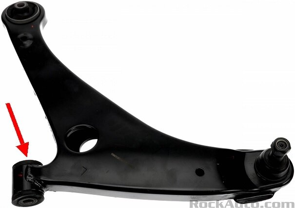 One thing to be aware of when replacing this part is when to tighten the bolt indicated by my red arrow in the photo below. This is the pivot point as the suspension travels up and down. That bolt should not be tightened while the car is jacked up and the suspension is hanging down. Doing so will hold the rubber bushing in that orientation, then, when the car is lowered onto the tires, the control arm will move up to its at-rest position, clamping that bushing in a permanent twist. That will greatly shorten the life of the rubber part. Instead, leave the bolt loose, bounce the car a few times, or drive it around the parking lot or block to settle it, then crawl underneath to tighten the bolt while the car is sitting at normal ride height. If you can't fit under there, it's okay to drive it to the alignment shop with that bolt loose, but tell the specialist about the new control arm and the need to tighten the bolt. Often, when we see a new part with this type of bushing, we will automatically loosen and retighten those bolts, even when you don't say anything. Alignments are always done on a drive-on hoist, so that keeps the cars at normal ride height while providing plenty of working room underneath.