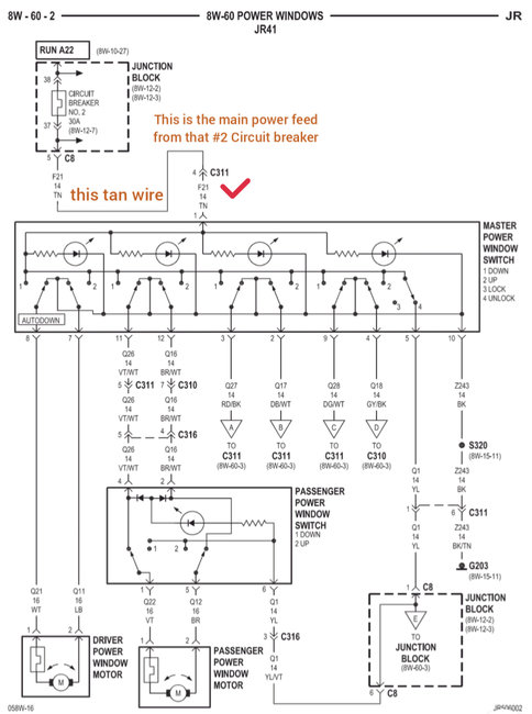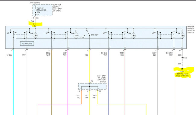 If that checks good, then we need to check the tan wire on the main switch (driver's side). All of the windows get power from that switch. Also, confirm the ground is good. (See the attached picture).