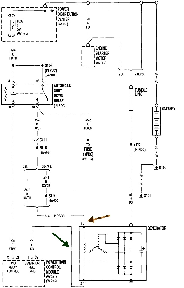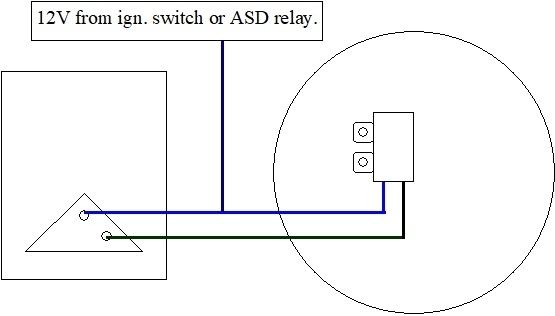 Next, I get to discuss some problems with this dark green wire. This same circuit was used on Dodge Shadows. We had three of them, donated by Chrysler, to my community college, that I used for training. On those models, there was an inline connector halfway between the computer and the alternator. I never did, and never allowed anyone to pierce wire insulation to take measurements. Instead, those connectors made dandy test points. That is a perfect place to touch a jumper wire, and to ground, to full-field the system. If you don't have an inline connector, or know where to find it, you're presented with a new problem. You can do this test right at the back of the alternator, however, both wires go through a black plastic block and emerge as two thin tabs bolted to the two small terminal bolts. When the system is working properly, it's easy to tell which tab goes with which wire by the voltages. It's when you have your problem of an open circuit, both voltages will be exactly the same. Which tab do you ground to perform the full-field test? If you try the correct one first, charging voltage will go up. If you grab the wrong one first, you'll blow the fuse feeding the ASD circuit. No harm done, but it is embarrassing. I do have a relatively simple trick to figure out which is the correct terminal to ground, but I can't give out all me secrets at once.