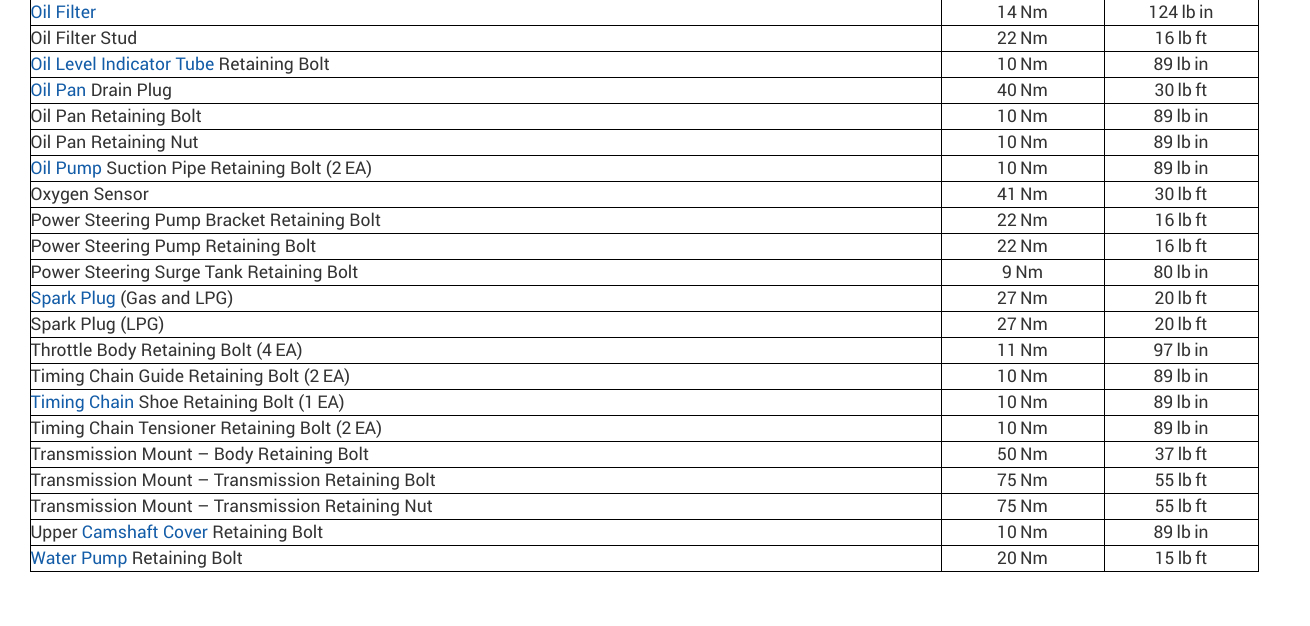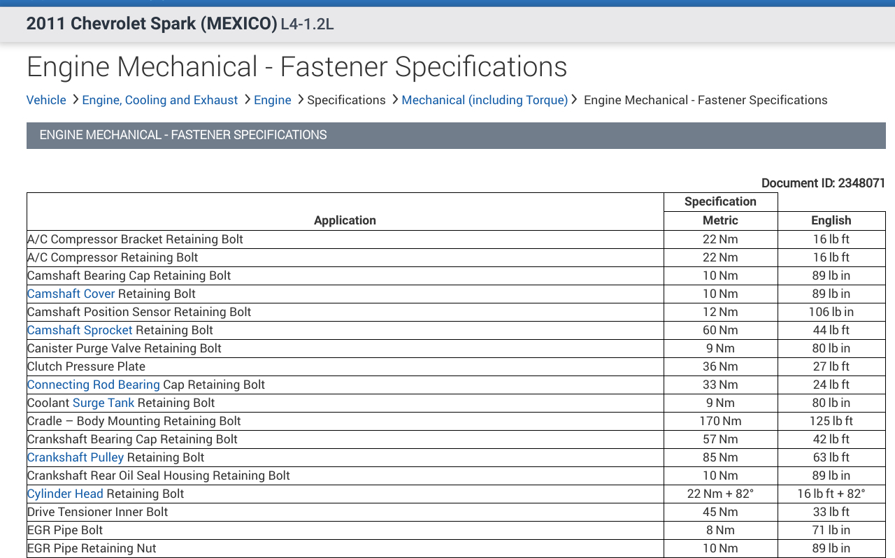 I don't have a listing for a 2010 Chevrolet Spark, but I have a listing for a 2011. In the diagrams down below I have included all of the torque specs for your vehicle engine assembly. I hope that this helps and please let us know if you need any others.