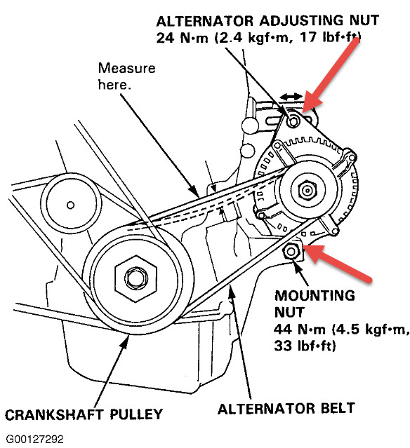 Loosen bolts where arrows are and spray penetrating oil on them if not loosening. Move alternator towards engine.